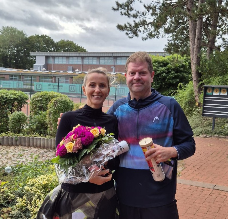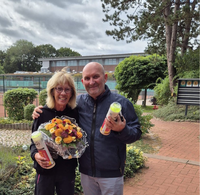 Ein besonderes Highlight an diesem Wochenende war das Tennisspiel unserer beiden Trainer. Unsere Karin Bornhold spielte gegen unseren Frank Schröder. Auf Plakaten wurde schon einige Tage vorher auf dieses hochklassige Match hingewiesen. Und viele Leute folgten dieser Einladung, denn auf unserer Anlage kam man sich wie auf dem Center Court vom Hamburger Rothenbaum vor. Und Karin und Frank zeigten uns wirklich traumhaft schönes Tennis. Es wurde wirklich alles geboten. Tolle Stops, wunderbare Longline- und Crossbälle, in einer Geschwindigkeit, die man eben nur auf einem Center Court sonst zu sehen bekommt. 2 Sätze lang durften wir zusehen. Nach hartem Kampf ging das Match mit 6:2 und 6:4 an Frank. Als Dank für dieses tolle Match wurde den beiden Hauptakteuren ein Blumenstrauß für die Dame und eine Flasche Sekt für den Herren überreicht.